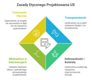 Etyczne projektowanie UX powinno zapewniać przejrzystość, kontrolę użytkownika i poszanowanie jego autonomii.