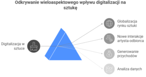 Digitalizacja globalizuje rynek, zwiększa dostęp do dzieł i umożliwia nowe formy monetyzacji. Twórcy mogą sprzedawać dzieła online, emitować NFT i korzystać z subskrypcji, co zmienia tradycyjne modele galerii i aukcji.