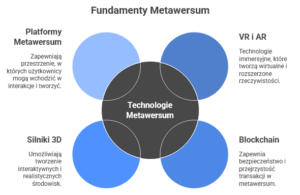 Podstawowe to VR, AR, blockchain, silniki 3D i platformy takie jak Decentraland czy Roblox. Dzięki nim możliwe są immersyjne doświadczenia i interakcje w czasie rzeczywistym.