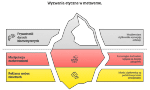 Nowe środowisko oznacza także nowe zagrożenia. W metaverse granica między światem realnym a wirtualnym staje się coraz bardziej płynna, co może prowadzić do nadużyć. Wśród kluczowych wyzwań etycznych znajdują się:
