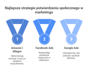 Amazon i Allegro prezentują liczbę recenzji oraz średnią ocenę produktu bezpośrednio w wynikach wyszukiwania – to klasyczny przykład potwierdzenia społecznego. Facebook Ads pozwala wyświetlać w reklamach nazwiska znajomych, którzy polubili daną stronę, a Google Ads często wykorzystuje liczby, np. „Zaufali nam już 3 000 klientów”. W kampaniach B2B skuteczne są także logotypy firm-klientów, referencje wideo i studia przypadków (case studies).