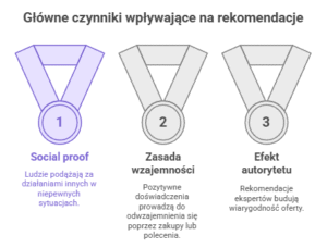 • Zasada wzajemności – pozytywne doświadczenie rekomendującego może wywołać chęć odwzajemnienia się poprzez zakup lub polecenie dalej.