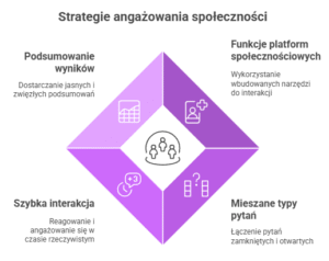 Do ankiet i pytań najlepiej wykorzystywać funkcje wbudowane w platformy społecznościowe, takie jak Instagram Stories, Facebook Groups, LinkedIn Polls, czy Slack/Discord dla społeczności B2B. Ważne jest łączenie pytań zamkniętych z otwartymi, a także szybka interakcja i podsumowanie wyników, aby uczestnicy czuli realny wpływ na społeczność.