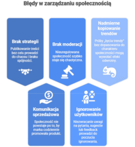 Najczęstsze błędy to brak jasno określonego celu, komunikacja wyłącznie sprzedażowa, brak moderacji, ignorowanie opinii użytkowników oraz nadmierne kopiowanie trendów. Te działania obniżają zaangażowanie i mogą prowadzić do utraty zaufania społeczności.